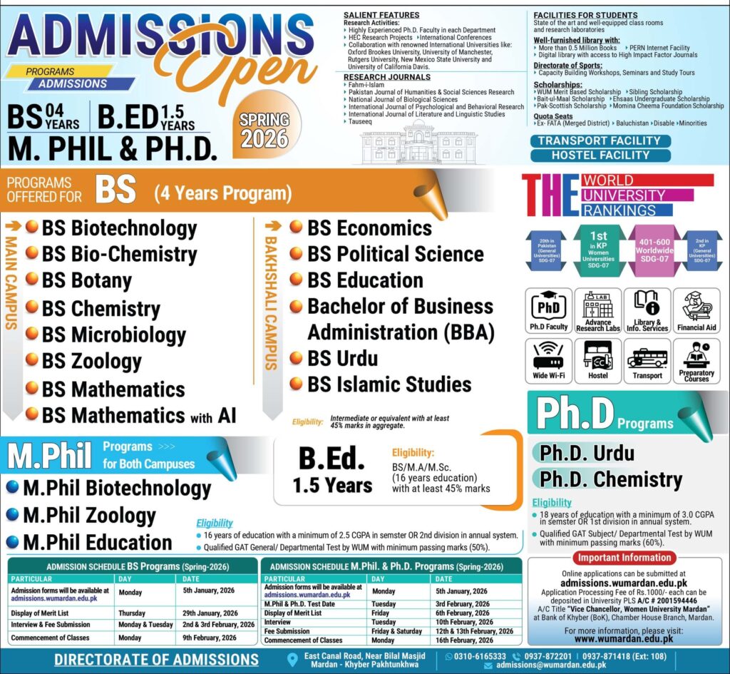 The Women University Mardan is planned to be a State of the Art institution imparting Quality Education; Teaching and Research in the field of Higher Education. The University provides cutting edge in the Career of a Student.