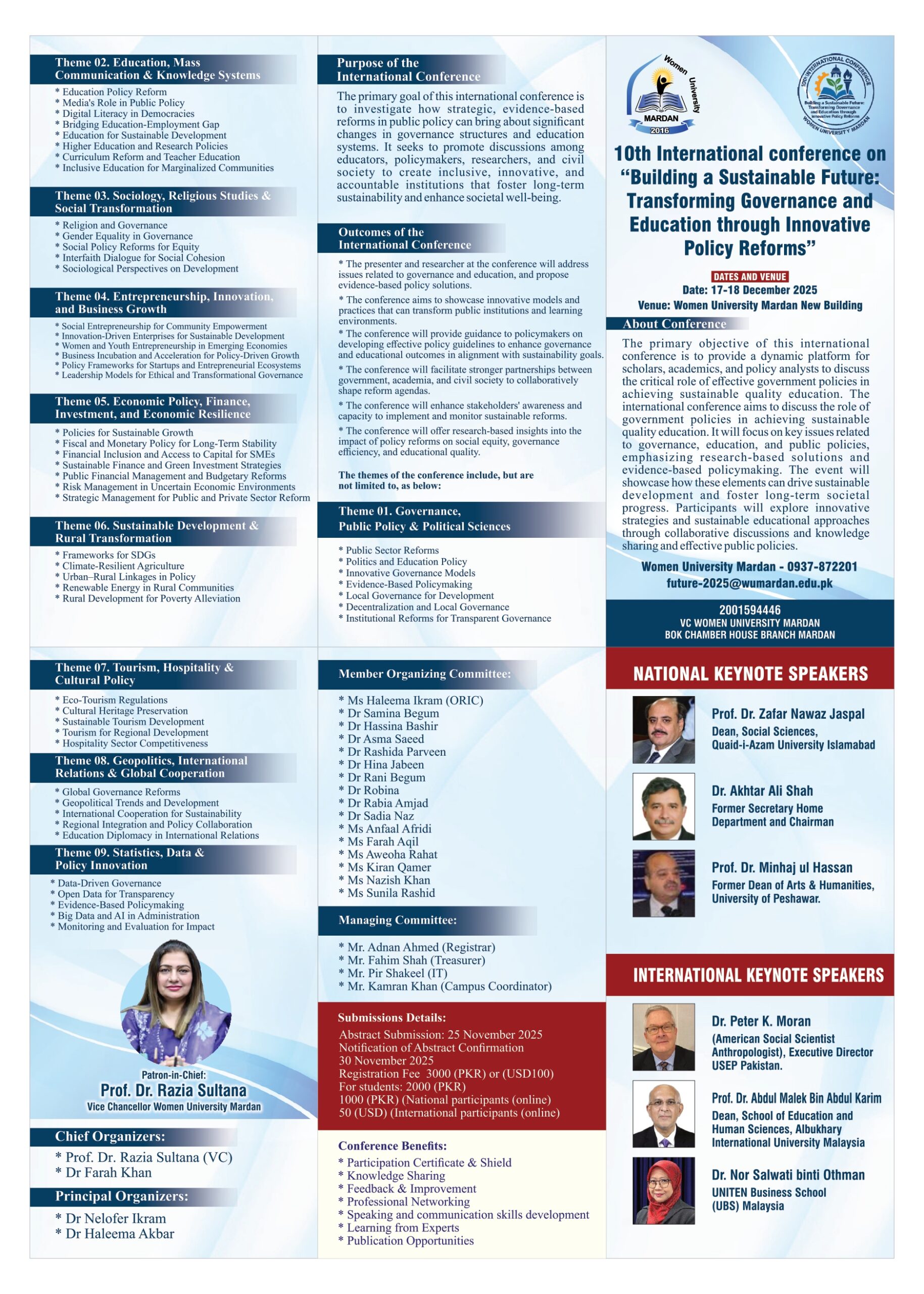 The primary goal of this international conference is to investigate how strategic, evidence-based reforms in public policy can bring about significant changes in governance structures and education systems. It seeks to promote discussions among educators, policymakers, researchers, and civil society to create inclusive, innovative, and accountable institutions that foster long-term sustainability and enhance societal well-being.