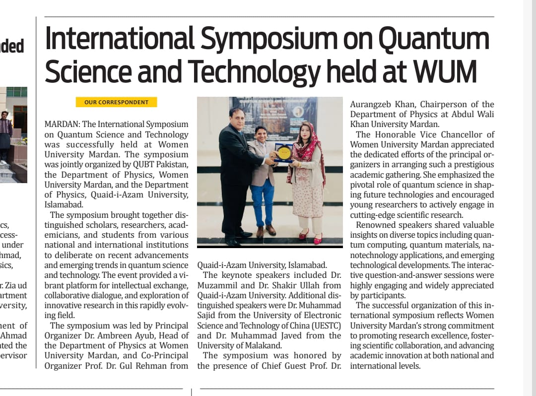 Women University Mardan successfully hosted the International Symposium on Quantum Science and Technology, bringing together distinguished scholars, researchers, and students from national and international institutions. The symposium was jointly organized in collaboration with QUBT Pakistan and Quaid-i-Azam University Islamabad.