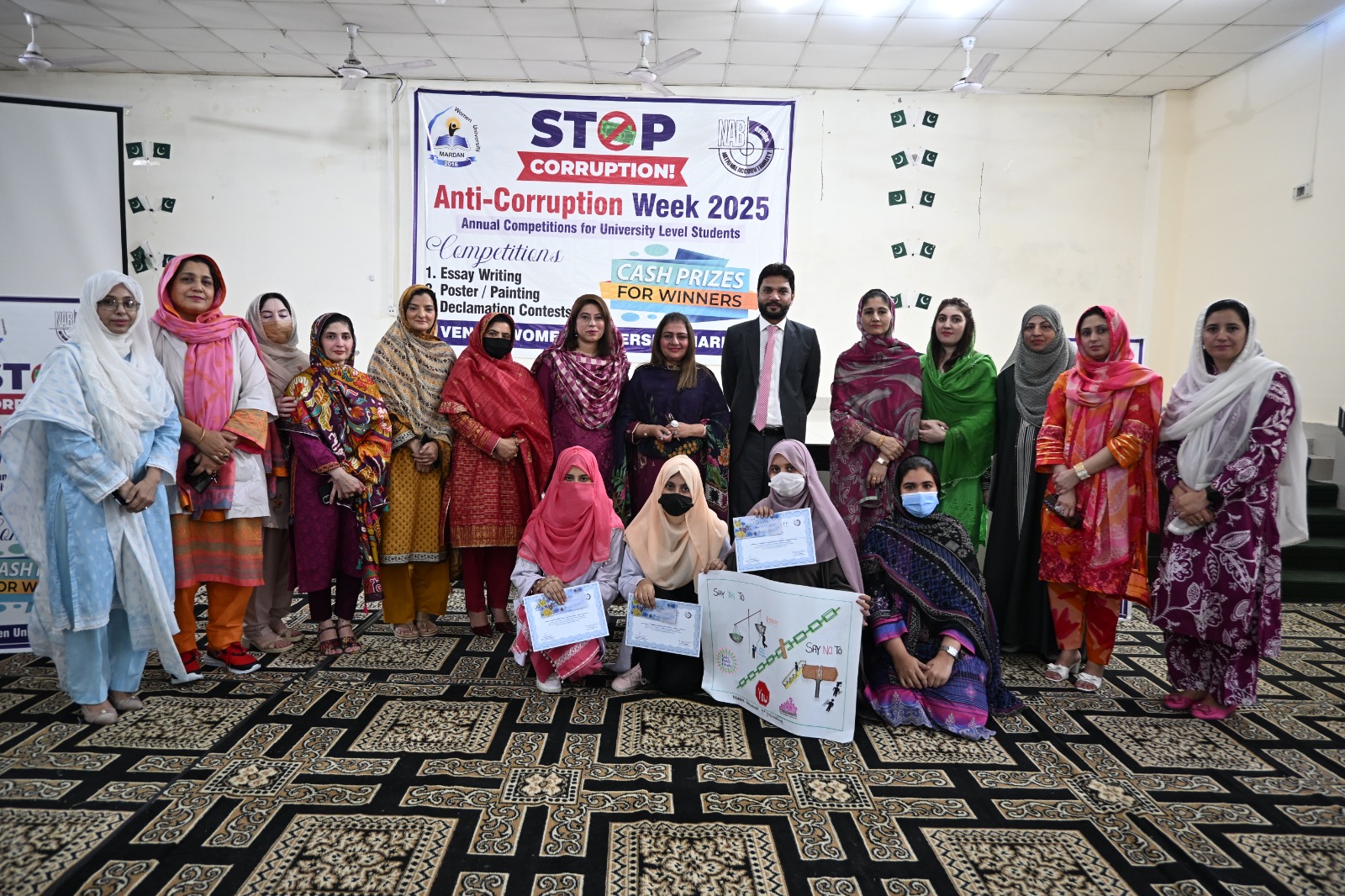 The ceremony concluded with the distribution of certificates and prizes among the winners of various competitions, followed by a group photo session to mark the successful culmination of Anti-Corruption Week 2025 at Women University Mardan.